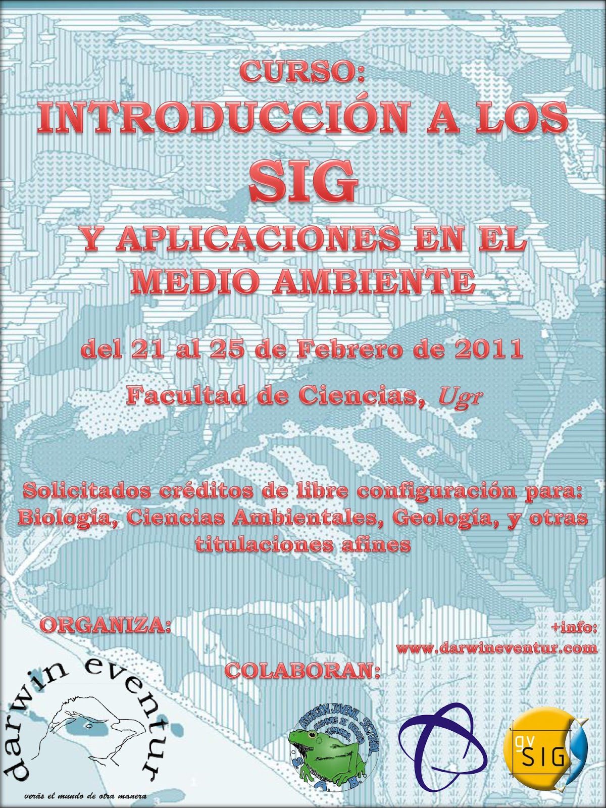 Hola, ya tenemos un nuevo curso en marcha, “Introducción a los SIG y aplicaciones en el Medio Ambiente“, del 21 al 25 de Febrero de 2011, en la Facultad de Ciencias de la Universidad de Granada en horario de tarde, de 15:00 a 21:30h.