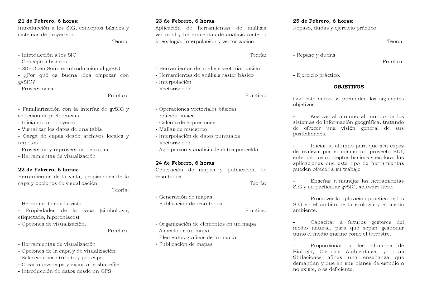 El curso tendrá 30 horas, donde se explicará que son los Sistemas de Información Geográficos, su aplicación en las distintas ramas de la Vida, y de forma práctica veremos un caso ficticio, donde tendremos un muestreo de contaminantes en el agua de la ria de Vigo, que puede afectar a bivalvos de la zona, y el tratamiento que realizaremos con el software libre gvSIG.