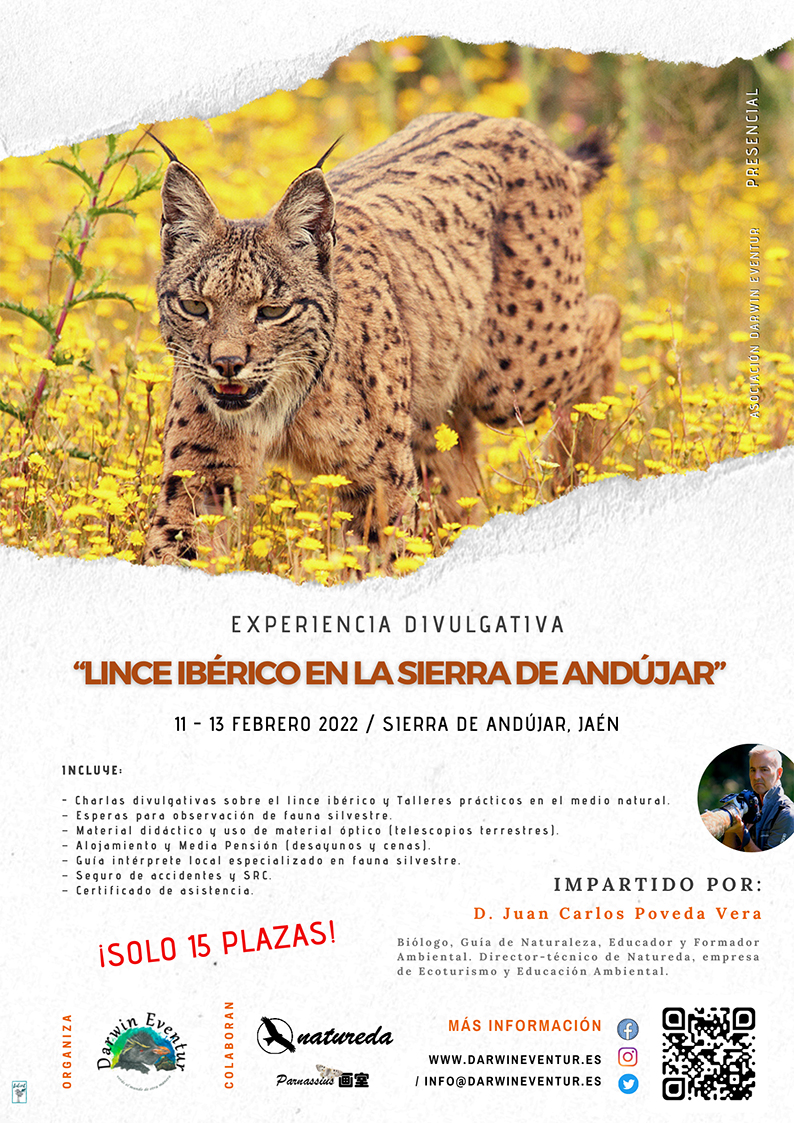 Esta experiencia aúna una formación divulgativa para aprender sobre esta magnífica especie, junto con la oportunidad de experimentar sensaciones únicas observando y buscando individuos de lince ibérico, y de otras especies silvestres, como muflón, nutria, águila imperial, águila real, buitre negro, alimoche, entre otros. Recorriendo el Parque Natural Sierra de Andújar y haciendo esperas al amanecer y al atardecer con unos paisajes de ensueño.